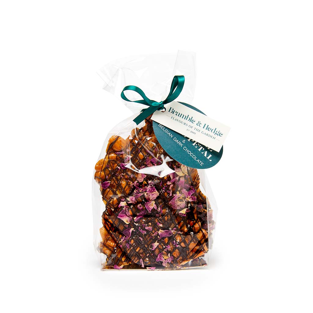 Bramble & Hedge hand made crunchy peanut brittle is available in a range of different flavours. Choose from flavours like Pomegranate or Salted Caramel & Rose Petals to name just two. These gorgeous hand decorated peanut brittle 200g packs are perfect if you are looking for a gift for someone special. Each pack is hand tied with ribbon and with their decoration of flowers and fruits look absolutely stunning. Bramble and Hedge Peanut Brittle contains nuts. May contain dairy and gluten.
