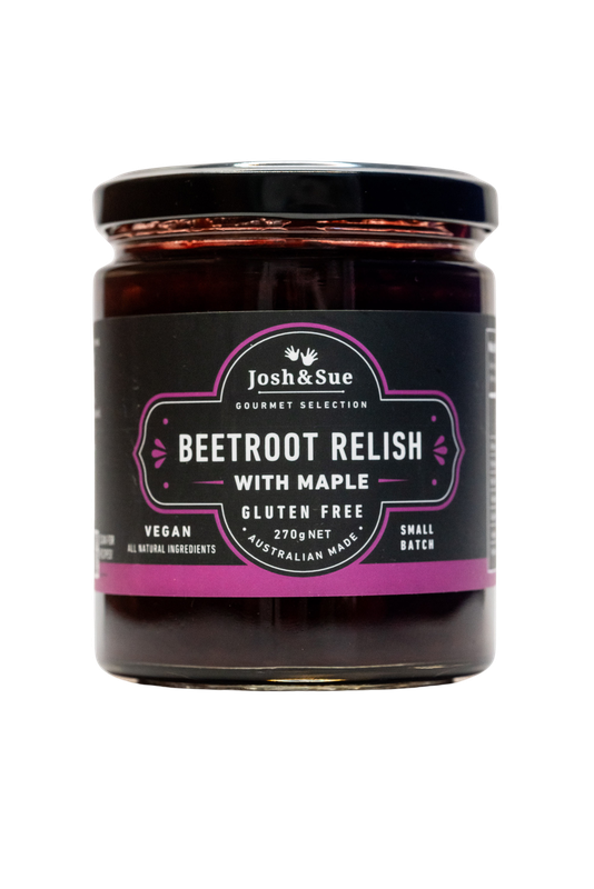 Josh & Sue's Chunky Beetroot relish has a lovely texture and is flavoured with Maple Sugar and Star Anise. Makes a great accompaniment to cheeses and meats, fabulous in sandwiches or stirred through thick Greek yoghurt to make a dip for pitta bread. Gluten Free and Vegan.