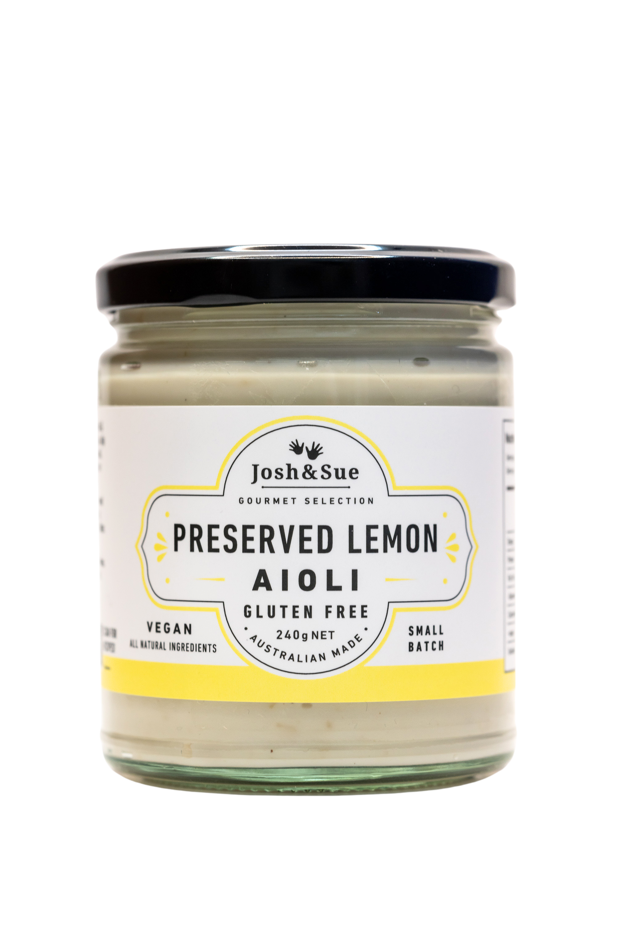 Josh & Sue Preserved Lemon Aioli. These aiolis are just great on salad, homemade hamburgers, meatballs, prawns.. the list is endless. This one has small pieces of Our Preserved Lemon in it. Gluten Free, Dairy Free and Vegan