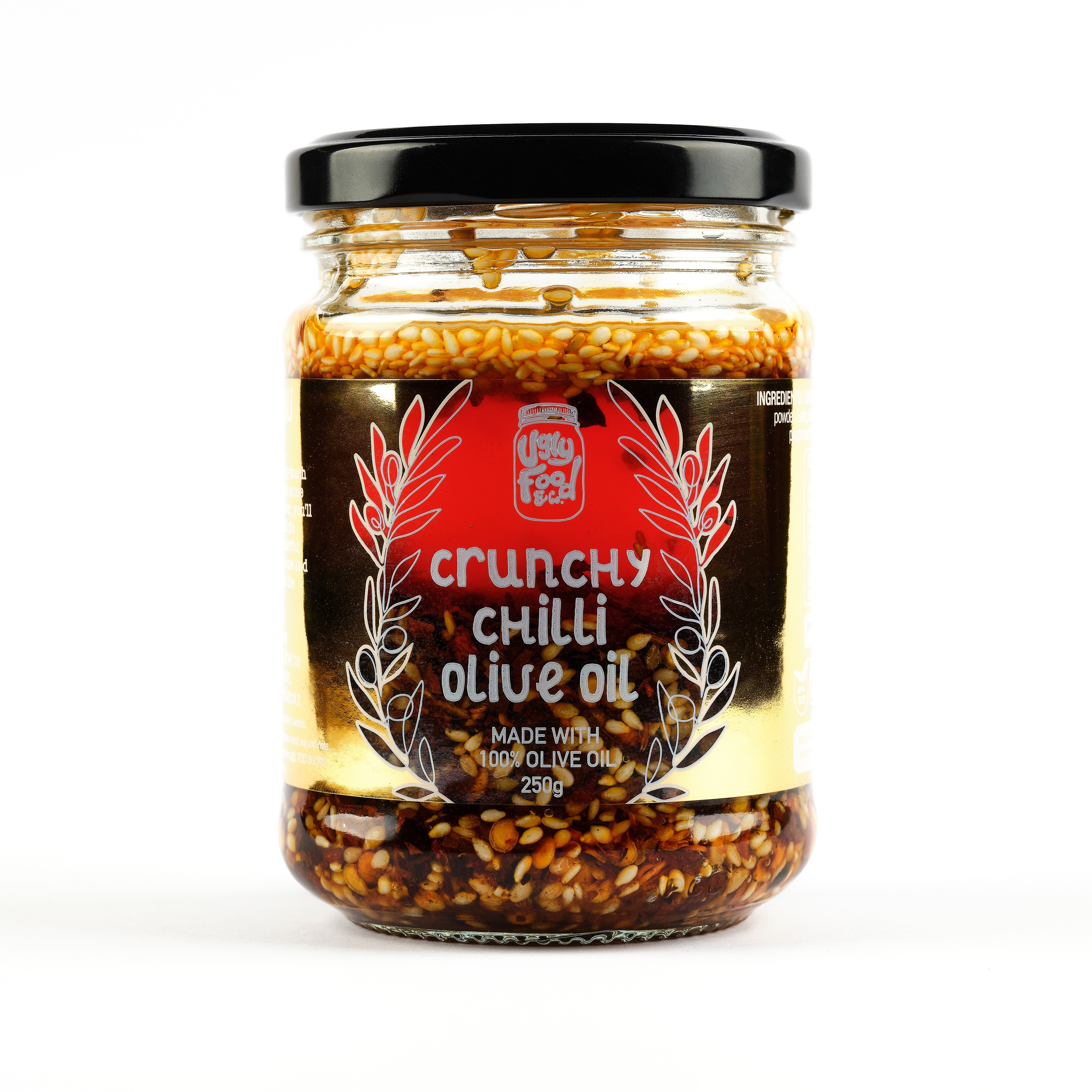 Ugly Food & Co Crunchy Chilli Olive Oil is mildly spicy garlicky oil with a crunch. Aromatic, fresh and a great balance of flavours. Goes with everything. Give that jar a good shake. Hand made in small batches with no artificial flavourings or preservatives. Vegan, Nut Free, Dairy Free, Gluten Free